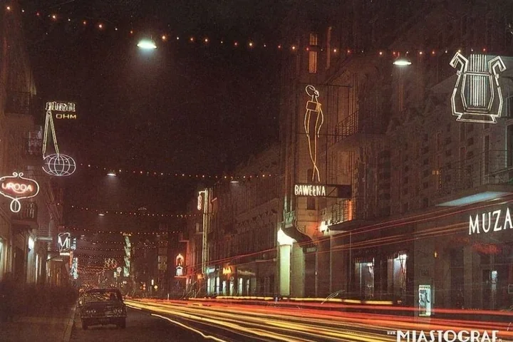 W archiwalnych kadrach Łódź nie tonie w szarości, tylko miga kolorami. Nad witrynami sklepów, szyldami kin i fasadami hoteli jarzą się neony, które zamieniały ulice w prawdziwy miejski spektakl. Dziś takie zdjęcia przypominają, że miasto miało kiedyś nocny blask, który sam w sobie był atrakcją.
