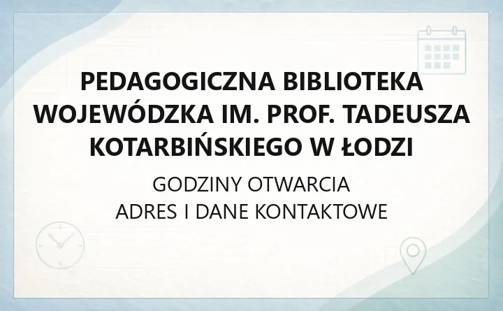 Pedagogiczna Biblioteka Wojewódzka im. prof. Tadeusza Kotarbińskiego w Łodzi to miejsce, które wspiera nauczycieli, pracowników oświaty, studentów przygotowujących się do zawodu nauczyciela i inne osoby zainteresowane kształceniem oraz wychowaniem. Na miejscu można wypożyczać książki i multimedia, korzystać z czytelni oraz szukać materiałów w katalogu online. Biblioteka udostępnia też kod do Legimi. Aby korzystać ze zbiorów, trzeba się zarejestrować jako użytkownik biblioteki.